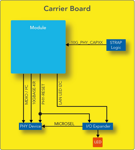- The 10GbE-LAN controller communicates the required LED behaviour to the I/O expander via the two-wire LAN LED I2C bus. For more information, see section I2C Data Mapping