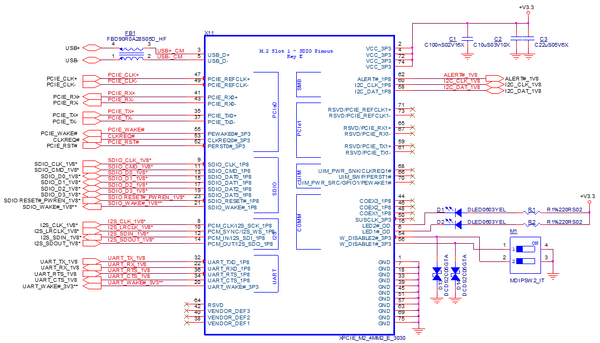 The reference design above (Figure 1) shows an M.2 Socket 1 - Key E used for connectivity applications. M.2 WiFi/Bluetooth expansion cards are usually connected via PCIe and USB. Other buses (e.g. SDIO and I2S) may not be supported by the COM.
